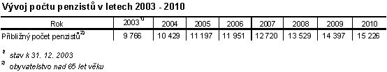 Podíváme-li se na tabulku možného vývoje počtu penzistů, zjistíme, že jejich počet se bude výhledově do roku 2010 rychle zvyšovat. Problém stárnutí populace se bude muset řešit změnou celé ekonomiky a veřejných financí.