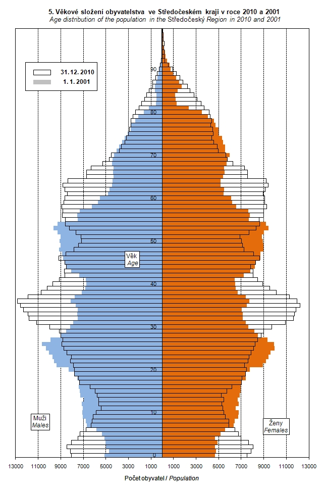 Graf 5 Věkové složení obyvatelstva ve Středočeském kraji v roce 2010 a 2001