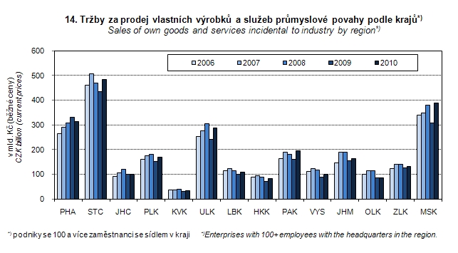 Graf 14 Tržby za prodej vlastních výrobků a služeb průmyslové povahy podle krajů