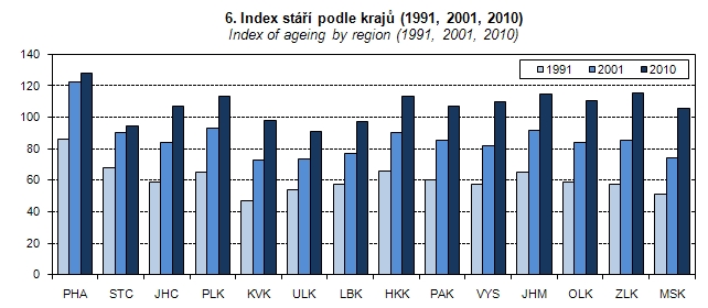 Graf 6 Index stáří podle krajů (1991, 2001, 2010)