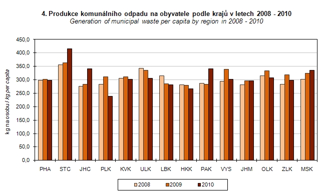 Graf 4 Produkce komunálního odpadu na obyvatele podle krajů v letech 2008 - 2010