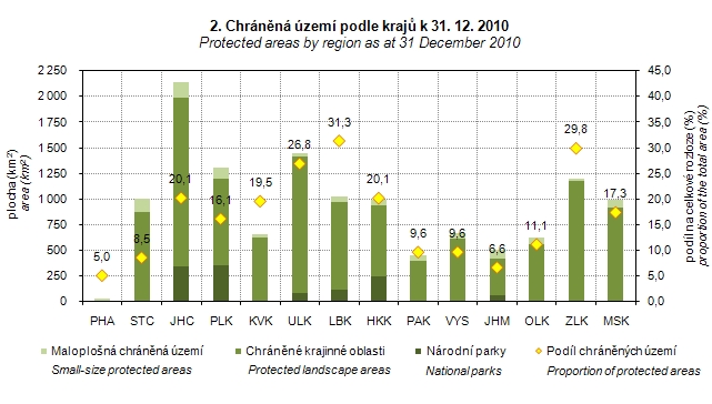 Graf 2 Chráněná území podle krajů k 31. 12. 2010