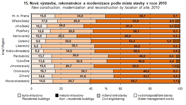 Graf 15 Nová výstavba, rekonstrukce a modernizace podle místa stavby v roce 2010