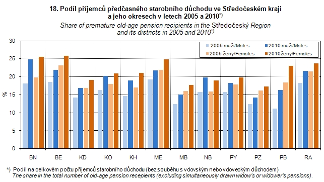 Graf 18 Podíl příjemců předčasného starobního důchodu ve Středočeském kraji a jeho okresech v letech 2005 a 2010