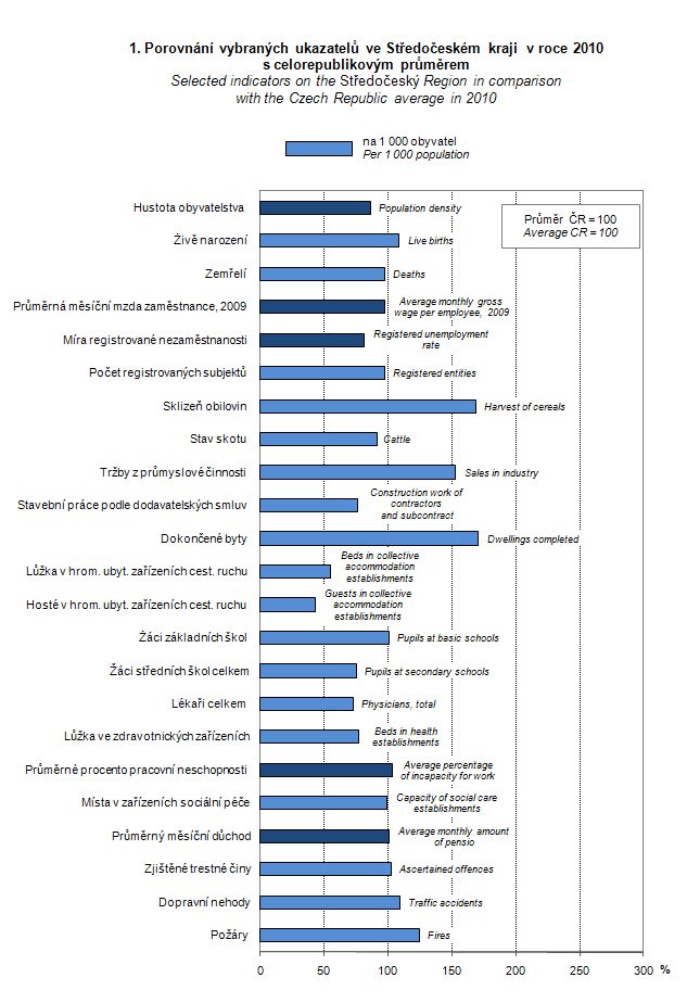 Graf 1 Porovnání vybraných ukazatelů ve Středočeském kraji v roce 2010 s celorepublikovým průměrem