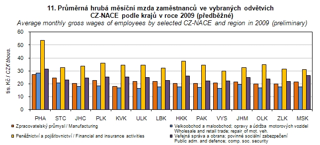 Graf 11 Průměrná hrubá měsíční mzda zaměstnanců ve vybraných odvětvích CZ-NACE podle krajů v roce 2009