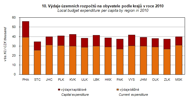 Graf 10 Výdaje územních rozpočtů na obyvatele podle krajů v roce 2010