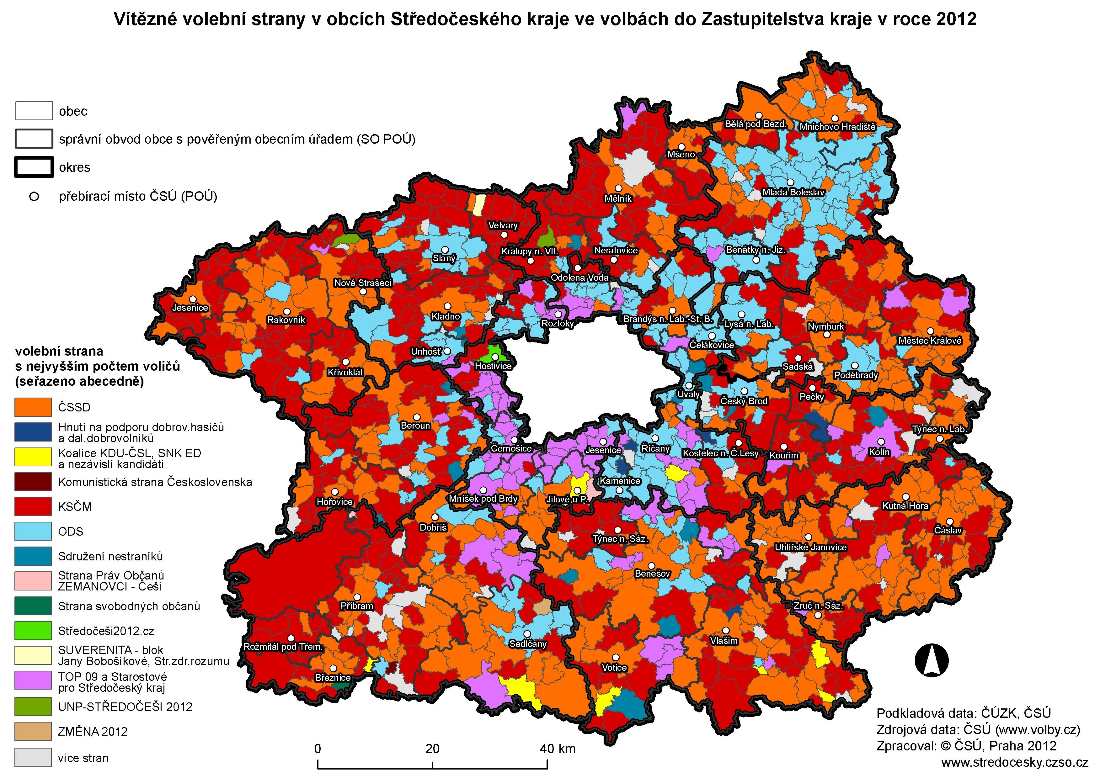 Kartogram 2 Vítězné volební strany v obcích Středočeského kraje ve volbách do Zastupitelstva kraje v roce 2012