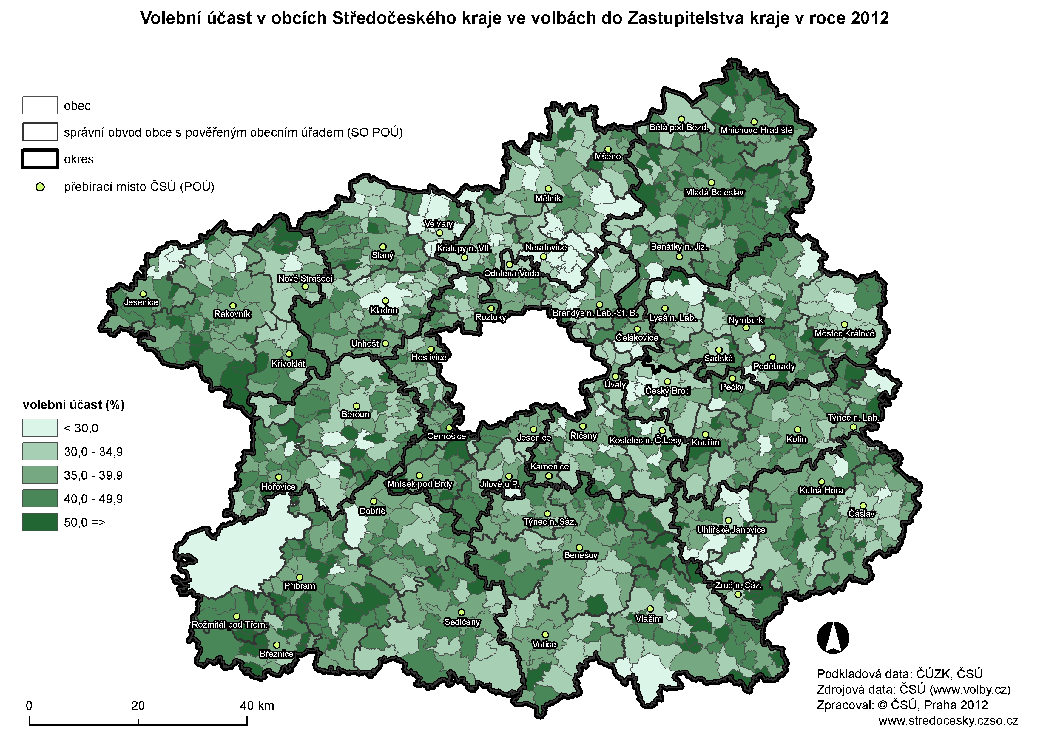 Kartogram 1 Volební účast v obcích Středočeského kraje ve volbách do Zastupitelstva kraje v roce 2012