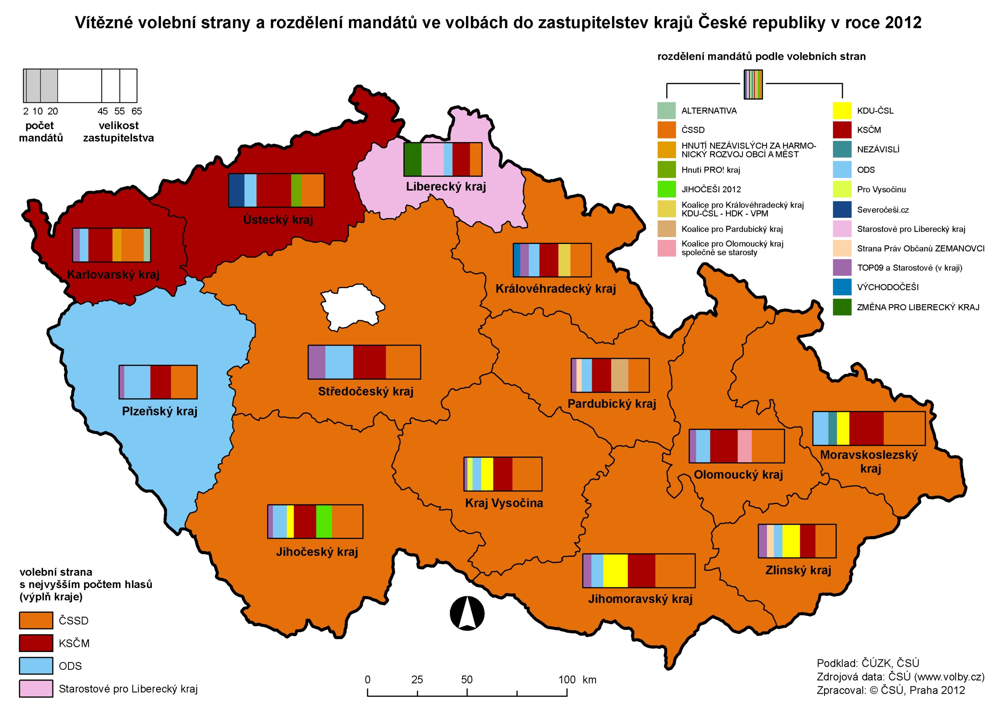 Kartogram 5 Vítězné volební strany a rozdělení mandátů ve volbách do zastupitelstev krajů České republiky v roce 2012
