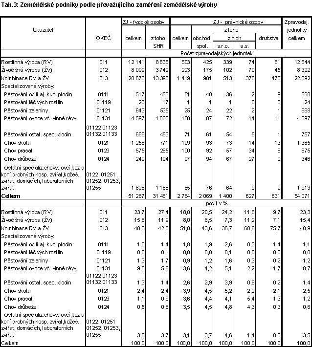 Výrazně nejvyšší počet zpravodajských jednotek, představující celých 40,9% podniků, stále provozuje kombinaci rostlinné a živočišné výroby, tedy klasickou zemědělskou výrobu. Klasické zemědělství zaujímá první místo jak u podniků fyzických, tak i právnických osob, a současně u všech sledovaných právních forem. Jednoznačně nejčastější je toto výrobní zaměření u družstev, a to u 75,7% počtu na 84% jejich výměry a u 60,0% počtu akciových společností na 83% jejich výměry. Druhou nejčastější je specializace na rostlinnou výrobu, a to především u SHR (27,4% počtu), dále u společností s r.o. (24,2% počtu). Třetí v pořadí je specializace na živočišnou výrobu - 15,8% počtu podniků fyzických osob, a v 11,2% počtu akciových společností. U specializované rostlinné výroby je pak nejčastější specializací pěstování ovoce včetně vinné révy, projevuje se u 4 697 zpravodajských jednotek (8,7%), z nichž je 4 597 (podíl 9,0%) podniků fyzických osob, zaujímající převážně menší plochy. Od 1 do 1,5% počtu podniků se pak pohybují další specializace rostlinné výroby: celkem 668 zpravodajských jednotek se specializuje na pěstování zeleniny, dalších 568 na pěstování obilí nebo jiných kulturních rostlin, 720 na pěstování květin a okrasných dřevin, 20 na pěstování a sběr hub a 8 na pěstování koření. Chov skotu je v rámci všech zpravodajských jednotek převažující u 2,5% počtu, a to především u společností s r.o. - 5,2% počtu. Na chov prasat se zaměřuje nejvíce akciových společností (5,4%), po nich společností s r.o. (4,1%). Tyto právní formy mají také nejvyšší podíl podniků specializovaných na chov drůbeže (4,8% společností s r.o., 4,3% akciových společností).