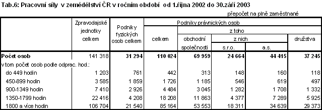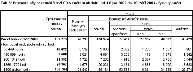 Za sledované roční období od října 2002 do září 2003 pracovalo v zemědělských podnicích bez ohledu na počet odpracovaných hodin celkem 163 273 osob. Na tomto čísle se podniky fyzických osob podíly 25,9%, podniky právnických osob 74,1%. Rozdíl mezi oběma hlavními skupinami podniků je ve výši podílu počtu osob s odpracovaným plným ročním fondem pracovní doby na celku. V podnicích fyzických osob představuje tento podíl 50%, v podnicích právnických osob je to 70%. Tato skutečnost znamená, že řada osob se v podnicích FO vedle práce v zemědělství zabývá ještě jinou výdělečnou činností. 1/