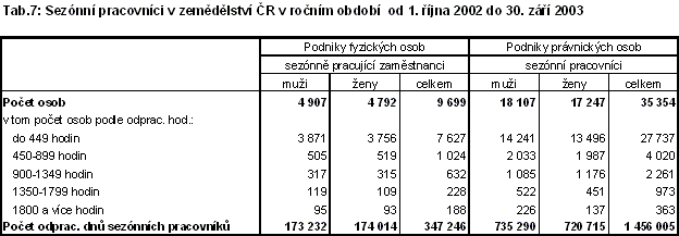 Podle metodiky EU jsou členové rodiny hospodáře započítáváni do celoročních pracovních sil, i když jsou zaměstnáni mimo hospodářství a v zemědělství jen pravidelně vypomáhají. Proto jsou v tabulce evidováni v podnicích FO jen nerodinní sezónní pracovníci. Počet odpracovaných dnů sezónních pracovníků přepočítává jimi odpracované hodiny na odpracované dny s osmihodinovou pracovní dobou. Z hlediska spotřeby práce pak z vykázaných údajů vychází, že v podnicích FO bylo v roce 2003 vynaložena práce ještě dalších téměř 1 400 pracovníků přepočtených na plně zaměstnané, v podnicích PO to bylo téměř 2 500 pracovních sil.