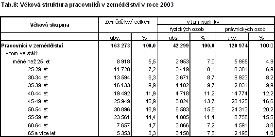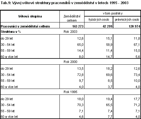 Z dostupných dat o věkové struktuře v časovém vývoji 1995 - 2003 musíme konstatovat postupné stárnutí pracovníků v zemědělství: pokles podílu pracovníků ve věku do 30 let v podnicích FO z 19,4% na 15,1% a v podnicích PO ze 17,7% na 11,8% při současném nárůstu podílu věkové kategorie 60 let a více, a to v podnicích celkem ze 4,6% na 8,0%, v podnicích FO dokonce ze 7,7% na 14,7%.