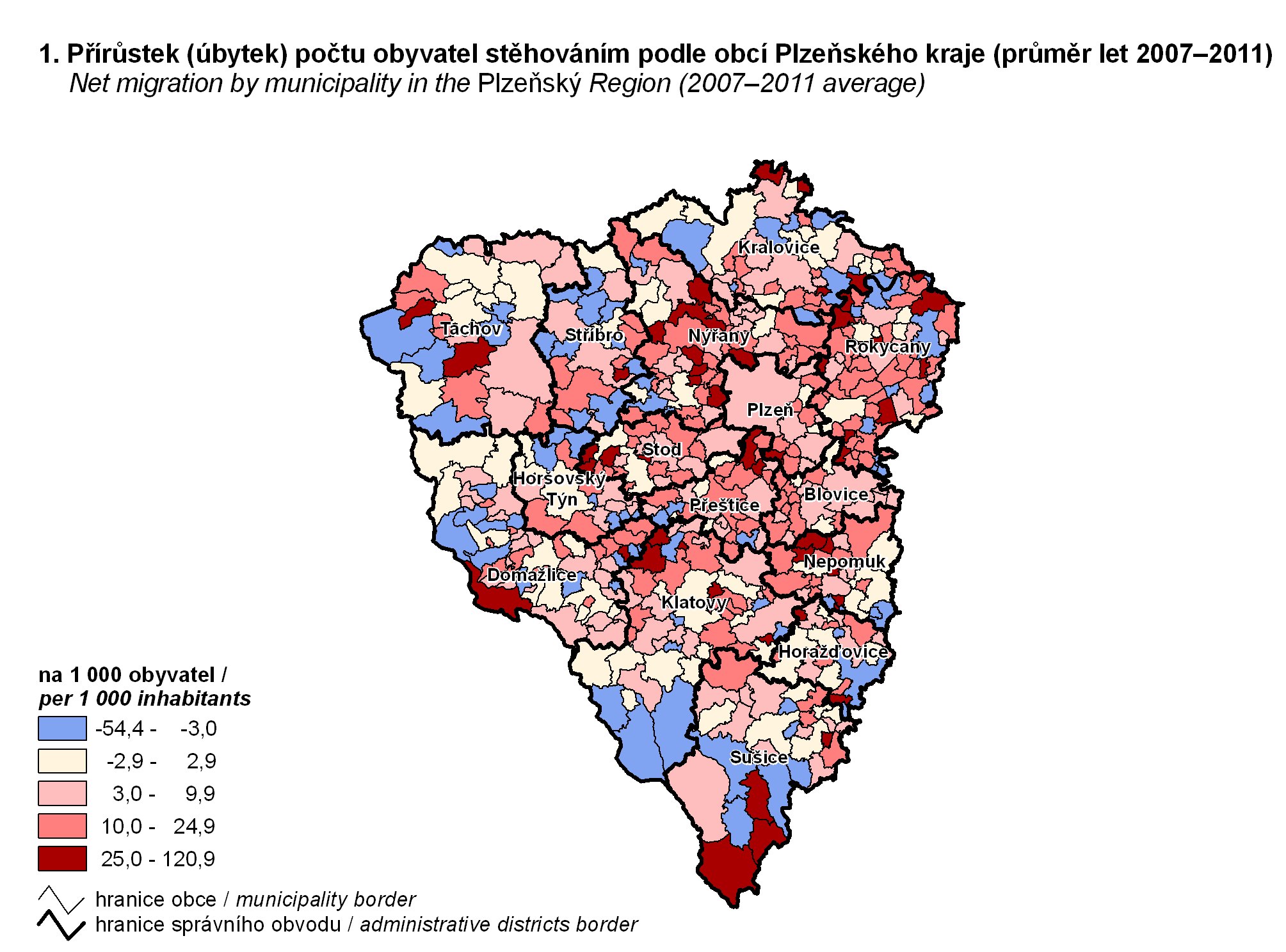 1. Přírůstek (úbytek) počtu obyvatel stěhováním podle obcí Plzeňského kraje (průměr let 2007–2011)