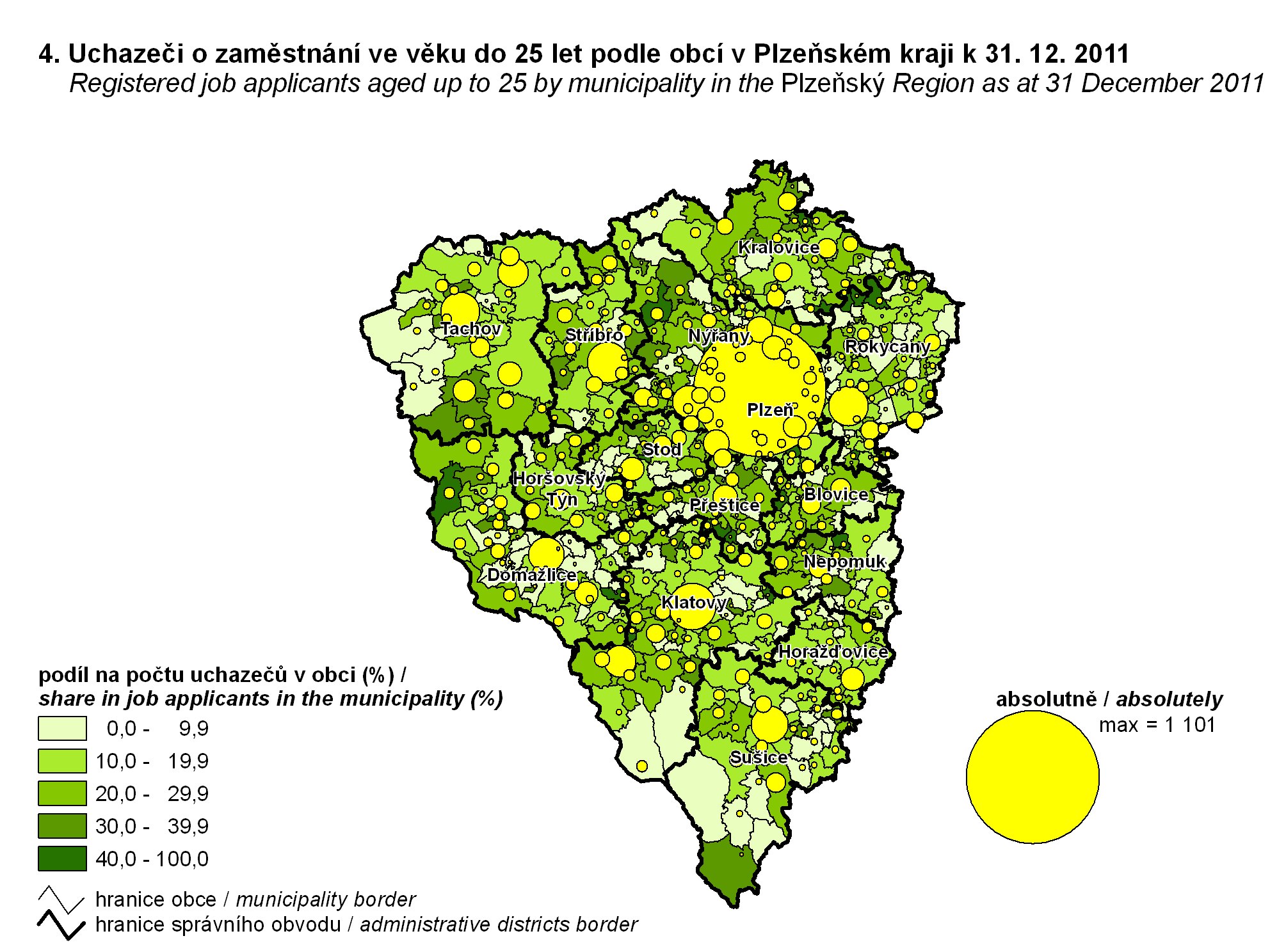 4. Uchazeči o zaměstnání ve věku do 25 let podle obcí v Plzeňském kraji k 31. 12. 2011