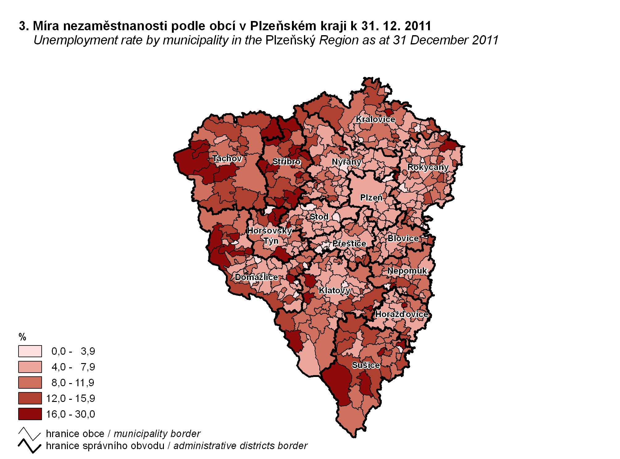 3. Míra nezaměstnanosti podle obcí v Plzeňském kraji k 31. 12. 2011