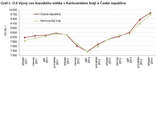 Graf O.6 Vývoj ceny kravského mléka v Karlovarském kraji a v České republice
