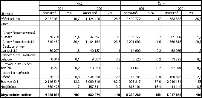 Jedním z nejdůležitějších demografických znaků charakterizujících podrobněji určitou skupinu či komunitu je jejich členění podle pohlaví na muže a ženy spolu s jejich věkovou strukturou. V případě náboženského vyznání nadále trvá tradice, že religiozita žen je výrazně vyšší než mužů. Zatímco věřících mužů bylo v roce 2001 sečteno 1 424 tisíc (28,6 % z jejich celkového počtu), věřící ženy dosahovaly vyššího počtu jak absolutně - 1 864 tisíc tak i relativně - 35,5 % z úhrnu. Ženy hlásící se k náboženství přitom představovaly ze všech věřících celkem 56,7 %. Srovnání s rokem 1991 zároveň ukazuje, že pokles věřících byl výraznější u mužů, ti ubyli za deset let o třicet procent, zatímco v případě věřících žen se jednalo jen o dvacet pět procent. Tento trend je přitom zaznamenatelný nejenom u úhrnu, ale rovněž u většiny jednotlivých církví. U Církve československé husitské například počet mužů poklesl o téměř polovinu, zatímco počet žen hlásících se k této církvi se snížil pouze o dvě pětiny. Ženy přitom převažují u všech etablovaných „domácích“ církví v čele s Církví římskokatolickou, kdežto u většiny „nových“ náboženství je tento poměr obrácený. Mužů více než žen se přihlásilo v případě islámu, budhismu a hinduismu, více mužů se hlásí také k Scientologické církvi, k Hnutí Hare Kršna, či Anglikánské církvi. Jednou z výjimek je Náboženská společnost Svědkové Jehovovi, kde se ženy podílí na celkovém počtu třemi pětinami, což je také důsledek výraznějšího zvyšování jejich počtu v posledním desetiletí oproti mužům.
