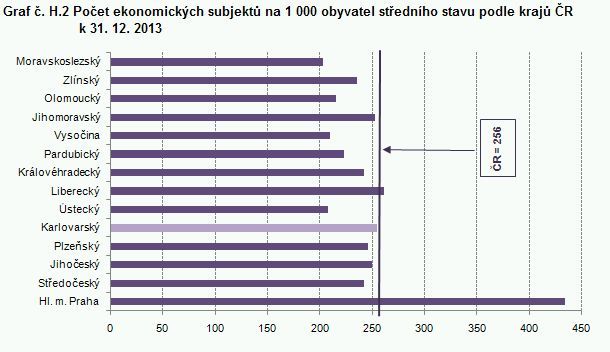 Graf H.2 Počet ekonomických subjektů na 1 000 obyvatel středního stavu podle krajů ČR k 31. 12. 2013