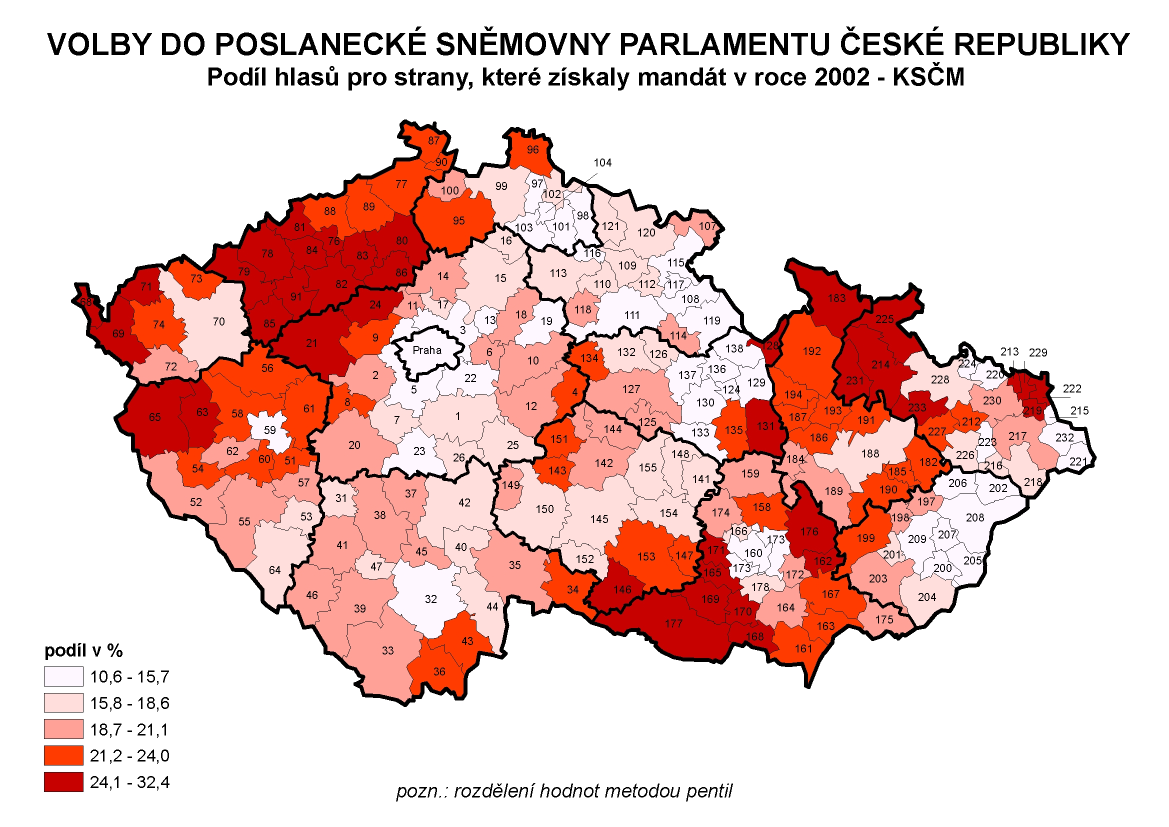 Podíl hlasů pro strany, které získaly mandát v roce 2002 - KSČM