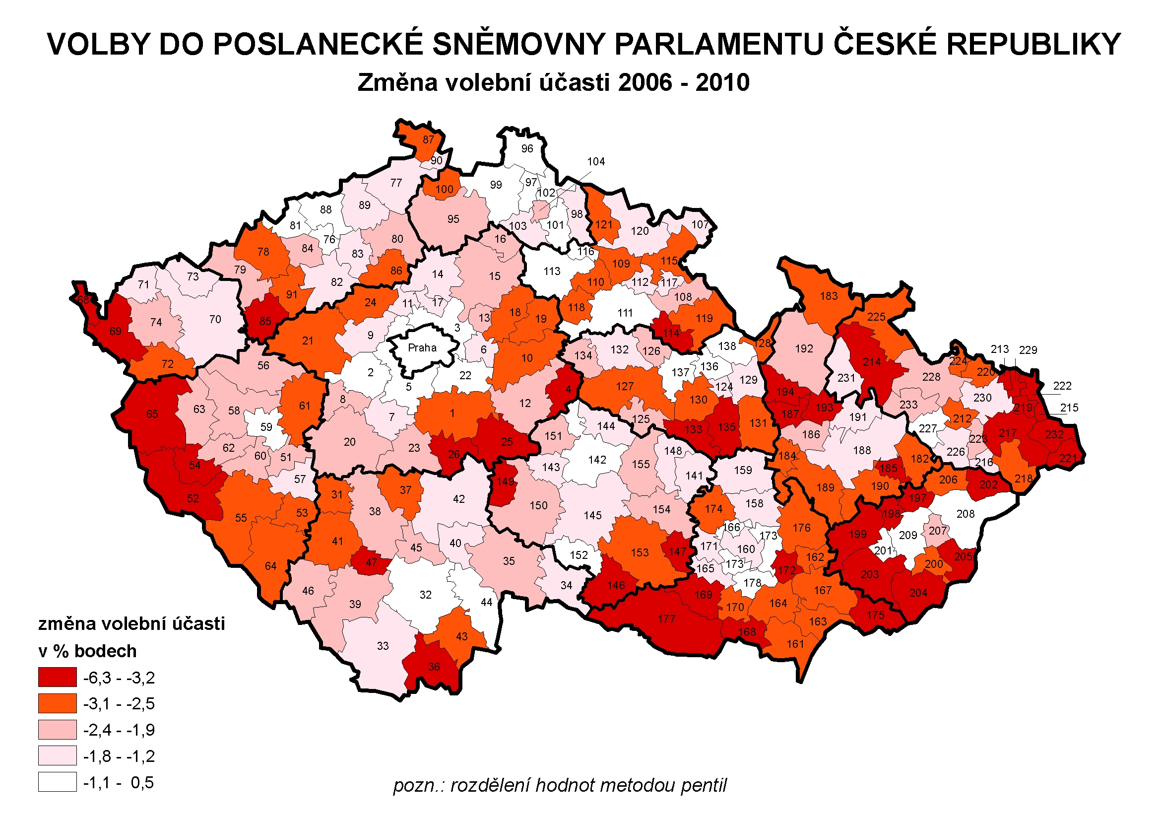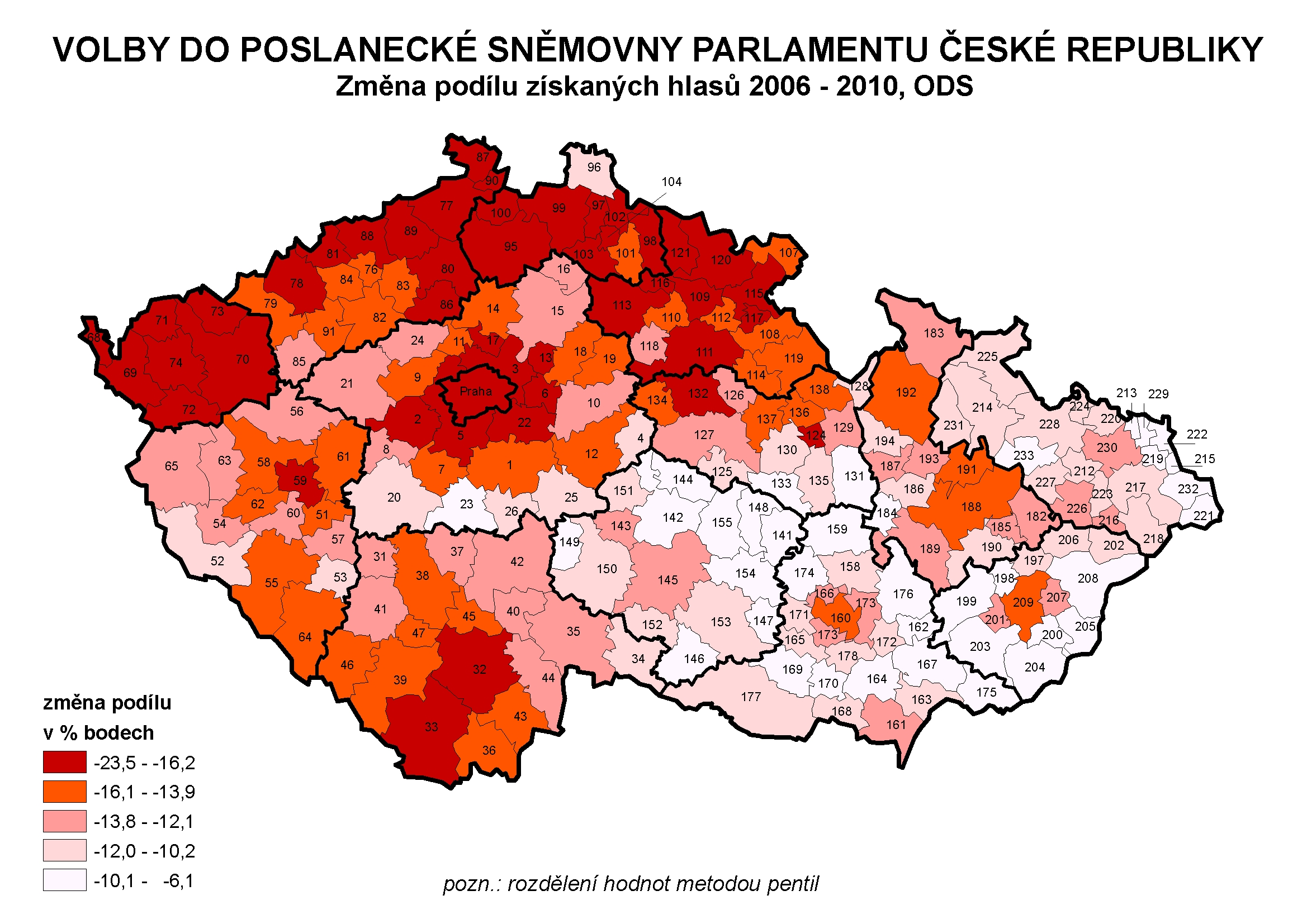 Změna podílu získaných hlasů 2006 - 2010, ODS