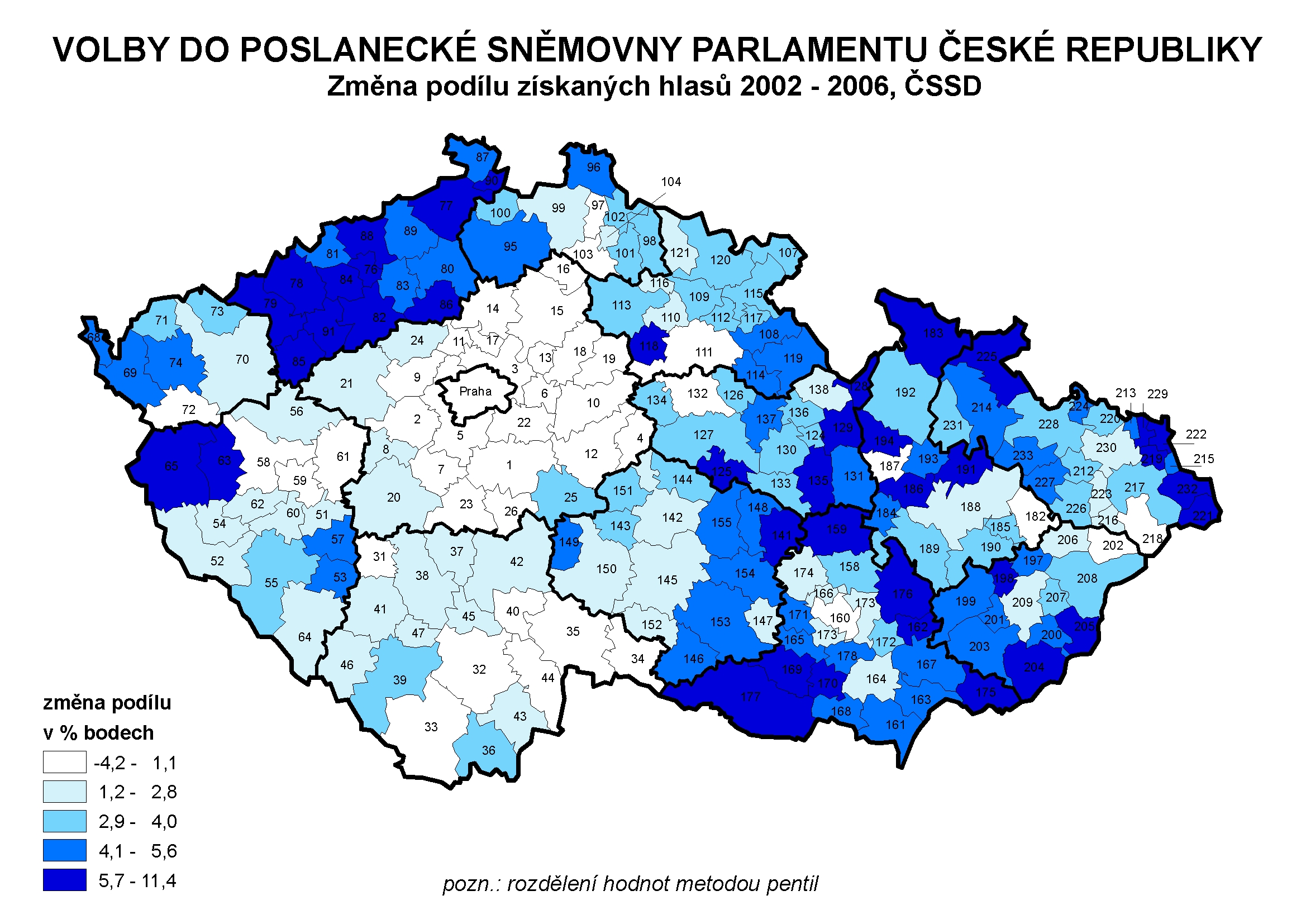 Změna podílu získaných hlasů 2002 - 2006, ČSSD
