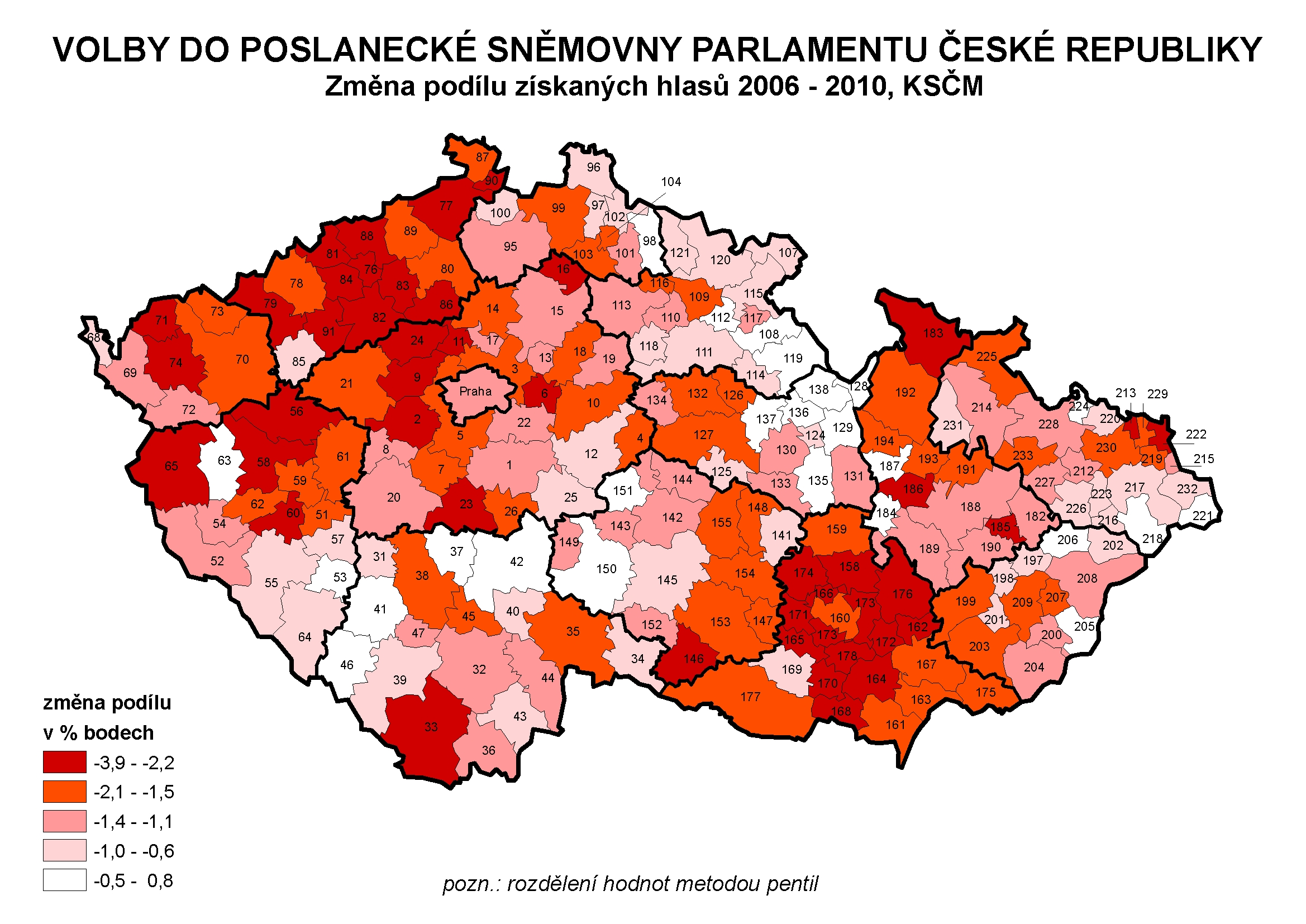 Změna podílu získaných hlasů 2006 - 2010, KSČM