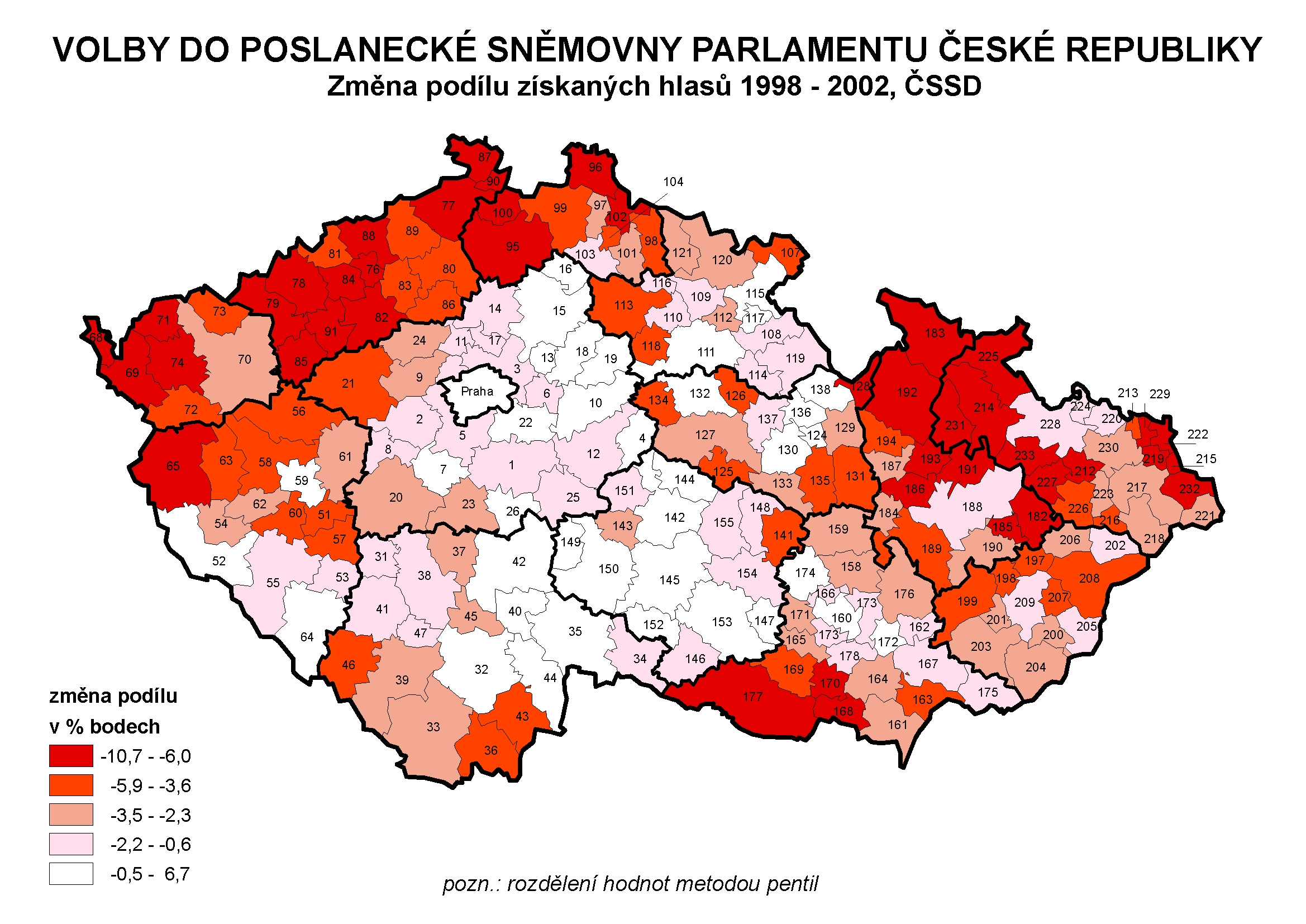 Změna podílu získaných hlasů 1998 - 2002, ČSSD