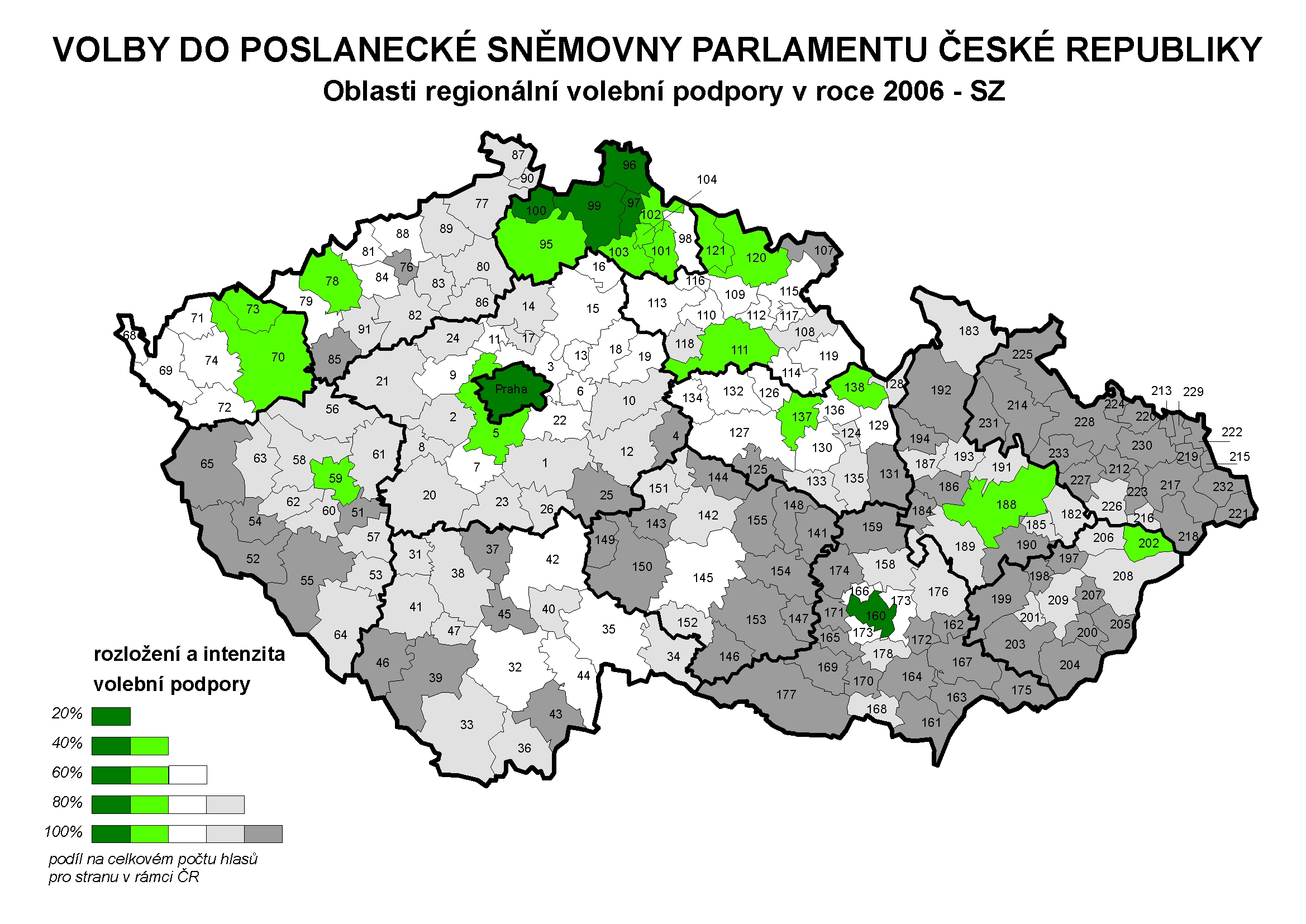 Oblasti regionální volební podpory v roce 2006 - SZ