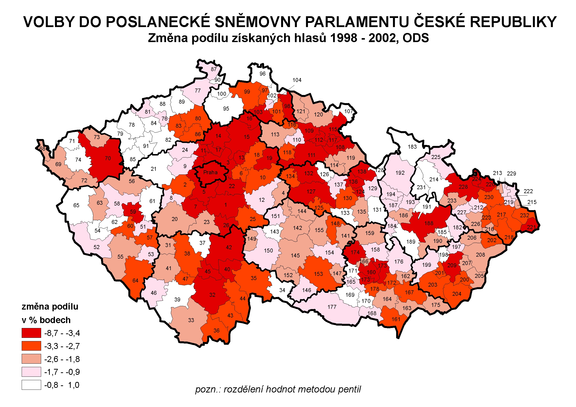 Změna podílu získaných hlasů 1998 - 2002, ODS