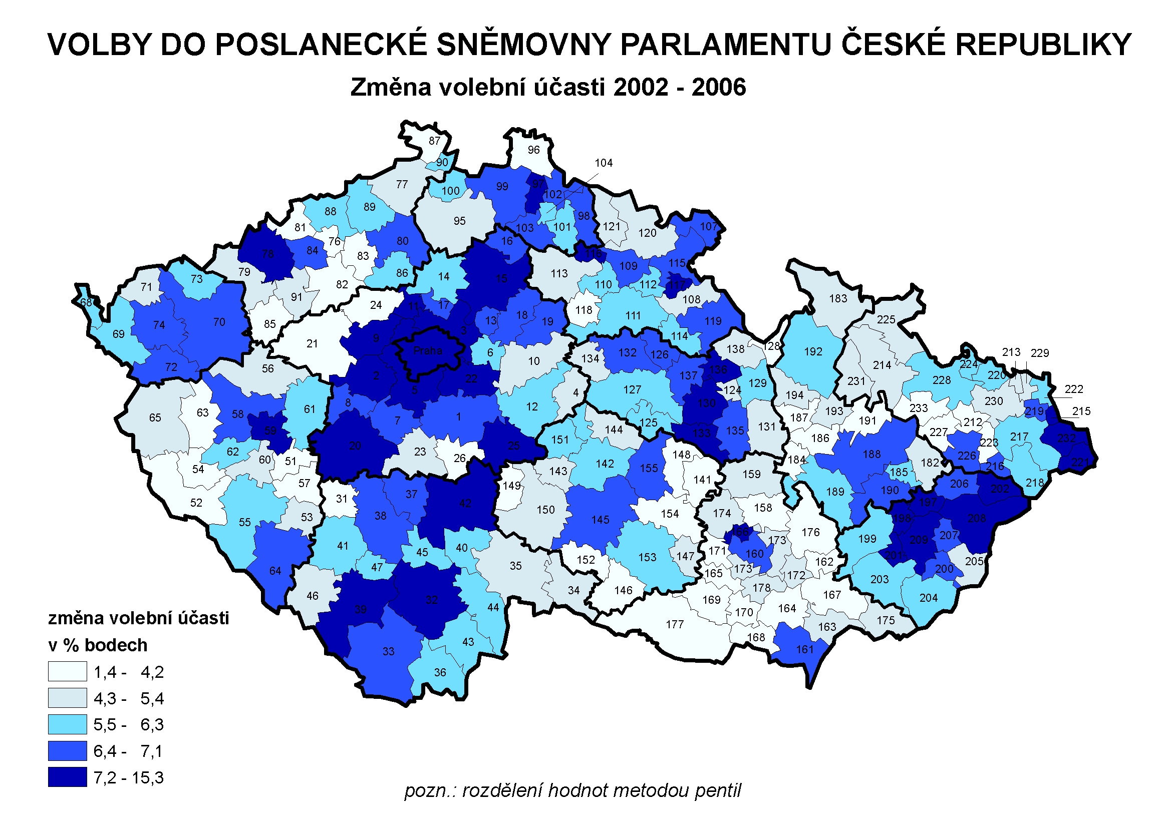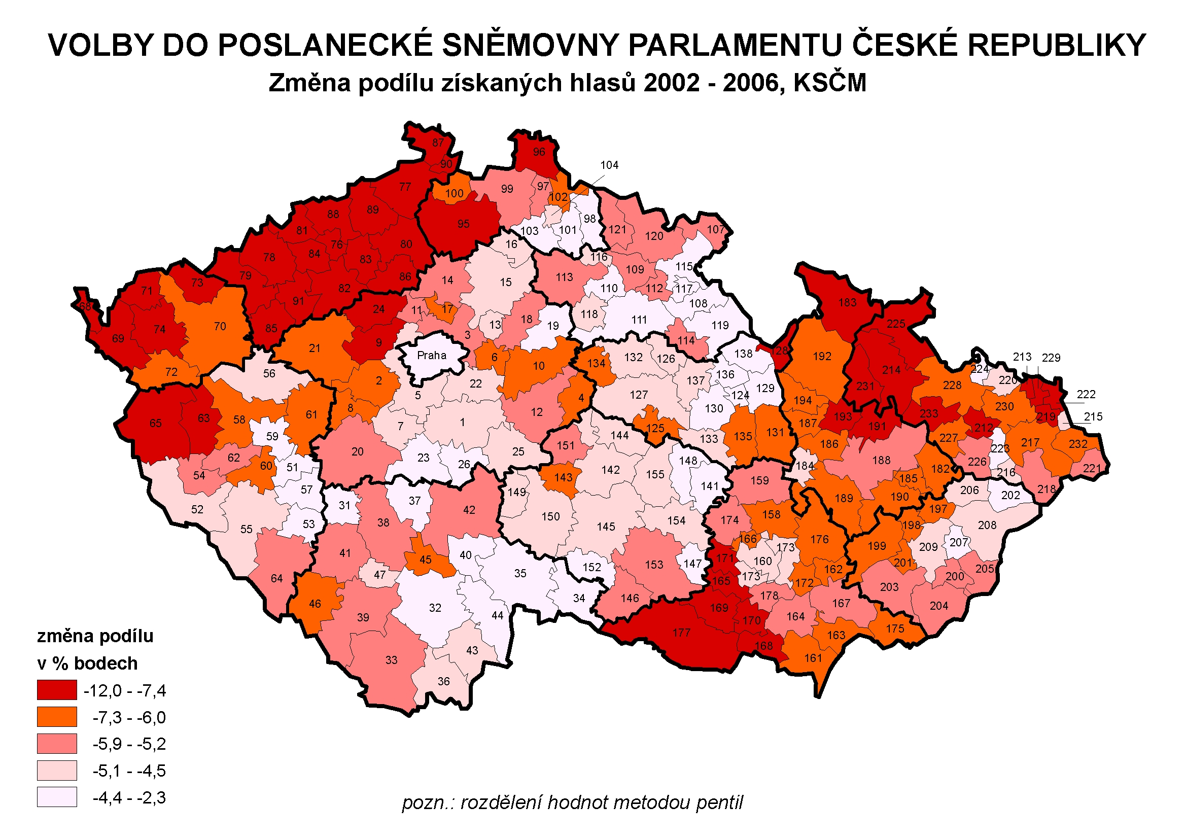Změna podílu získaných hlasů 2002 - 2006, KSČM