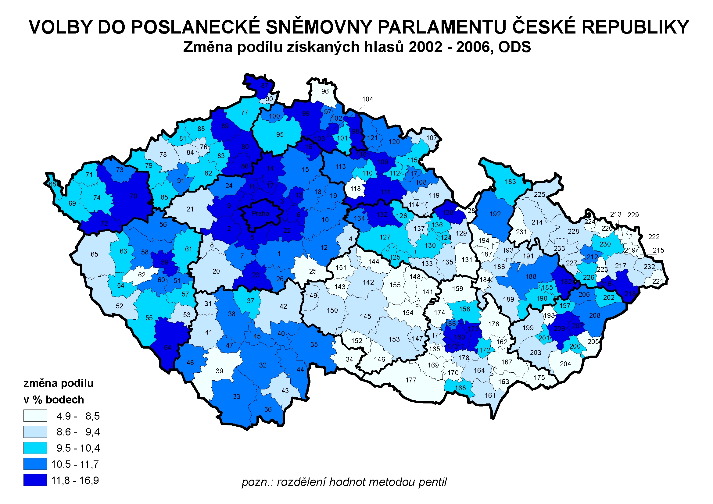 Změna podílu získaných hlasů 2002 - 2006, ODS
