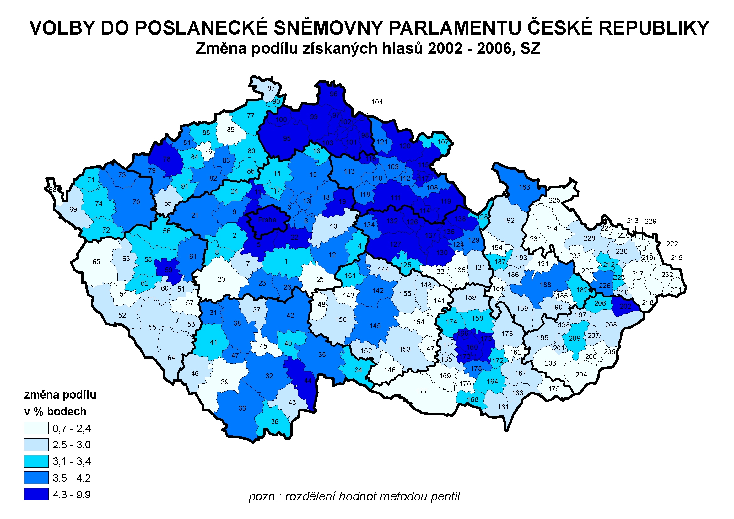 Změna podílu získaných hlasů 2002 - 2006, SZ
