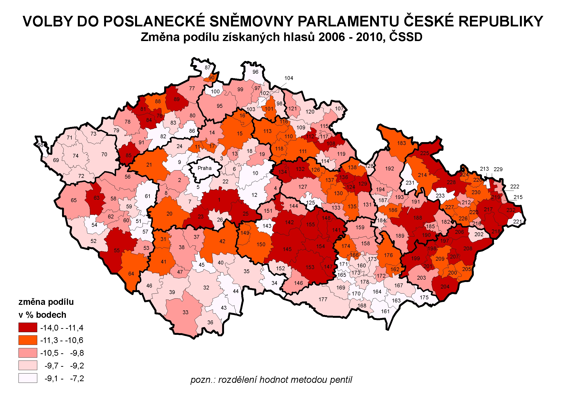 Změna podílu získaných hlasů 2006 - 2010, ČSSD