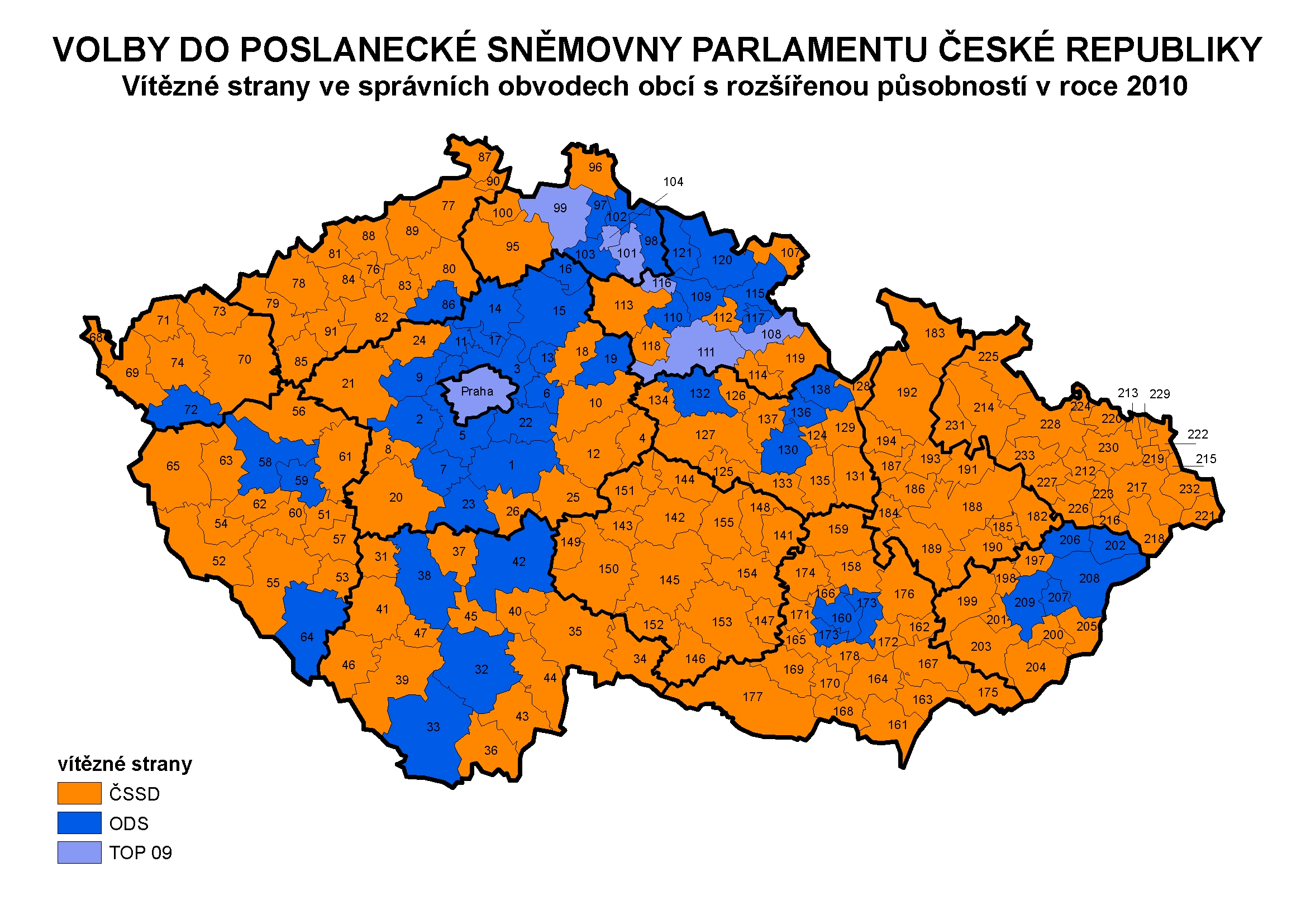 Vítězné strany ve správních obvodech obcí s rozšířenou působností v roce 2010