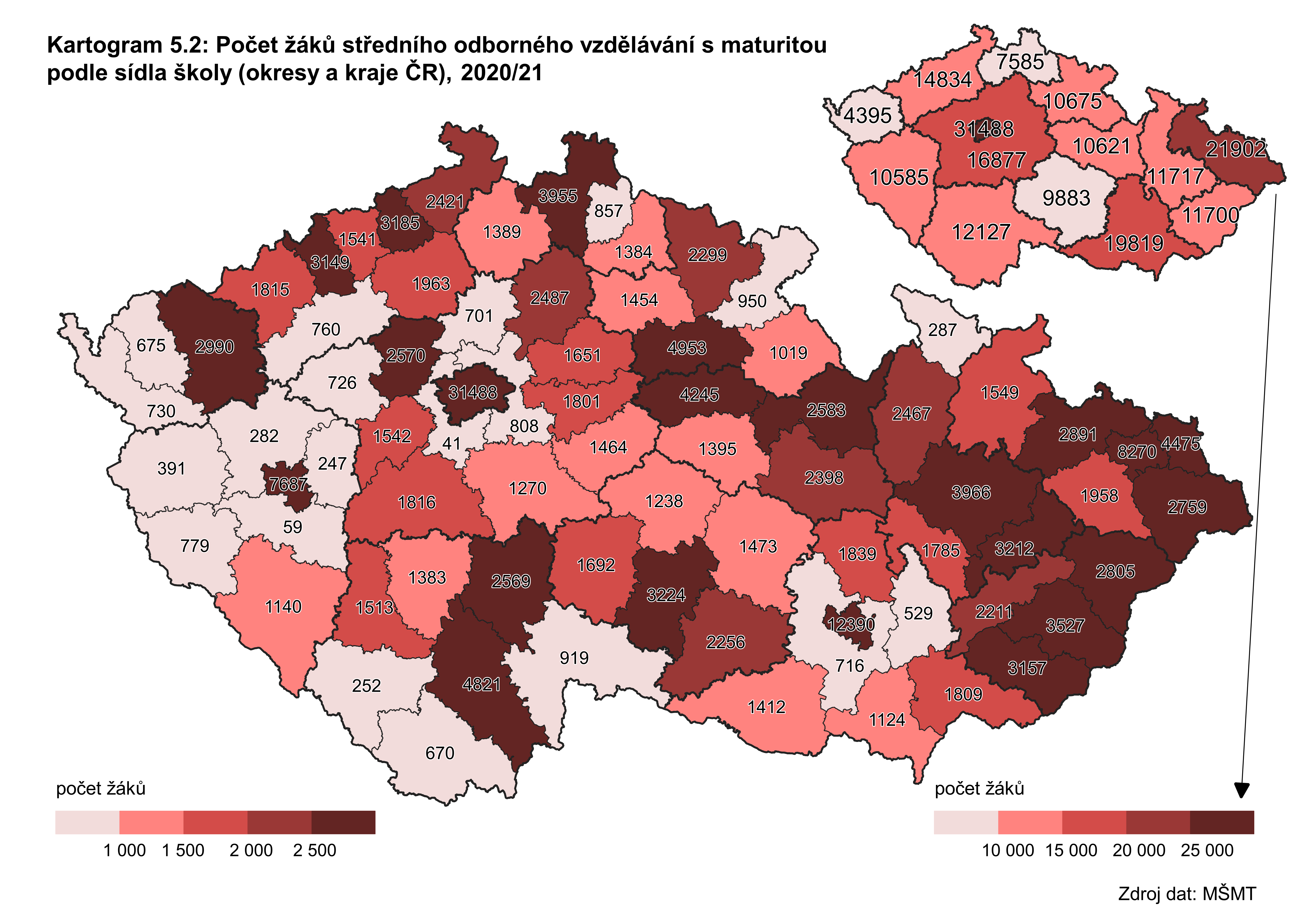 5.2 Počet žáků středního odborného vzdělávání s maturitou podle sídla školy (okresy a kraje ČR), 2020/21
