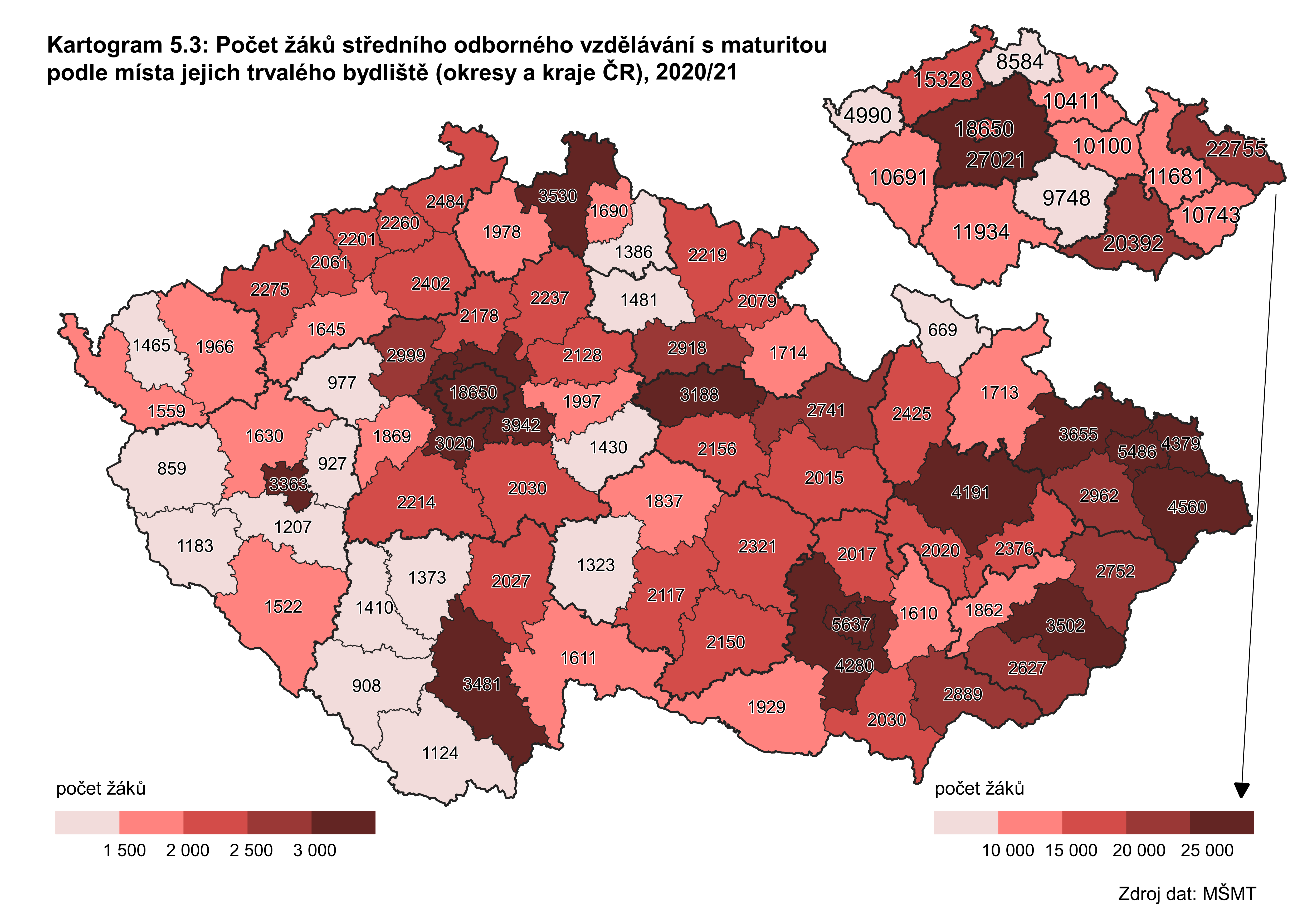 5.3 Počet žáků středního odborného vzdělávání s maturitou podle místa jejich trvalého bydliště (okresy a kraje ČR), 2020/21