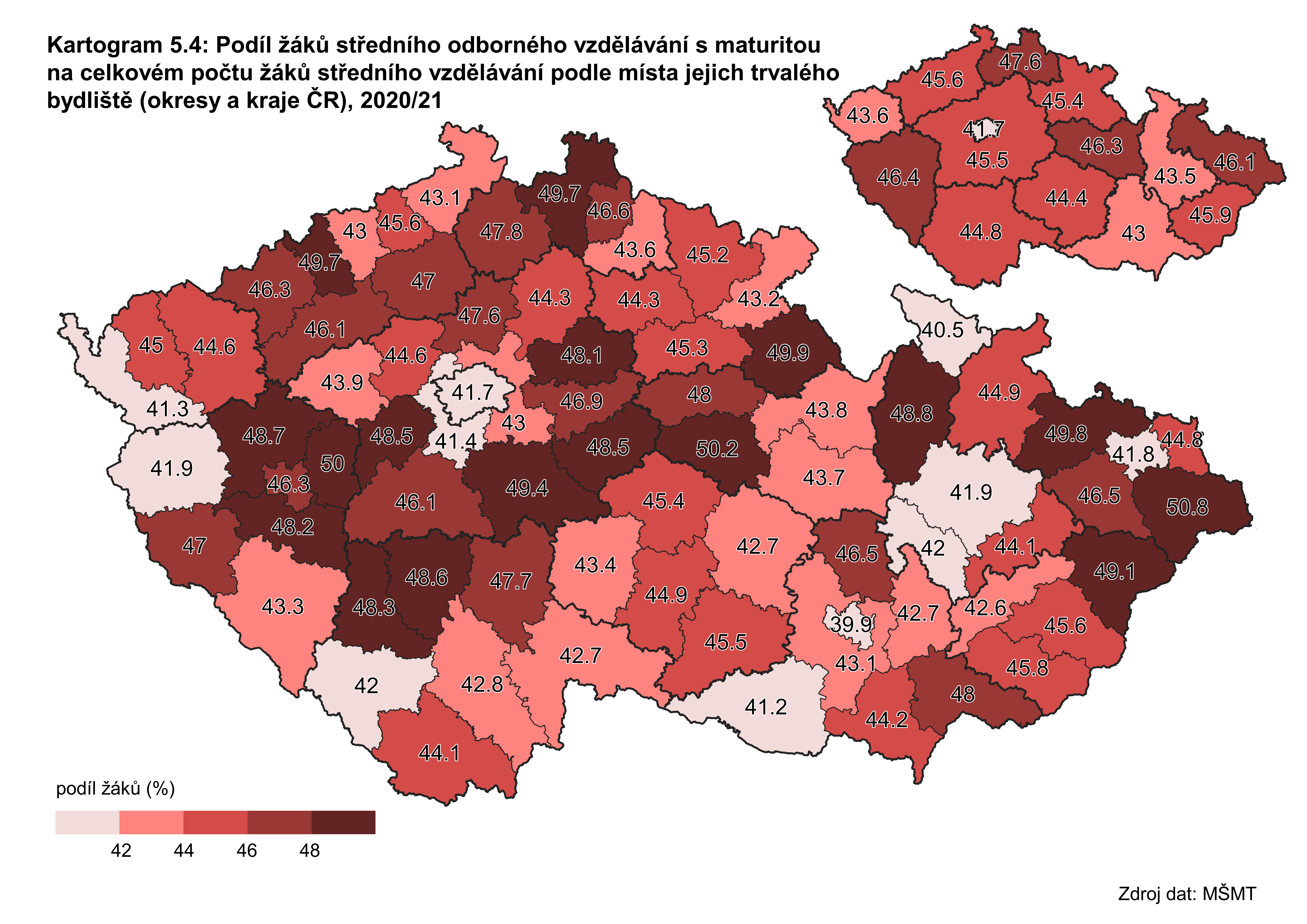 5.4 Podíl žáků středního odborného vzdělávání s maturitou na celkovém počtu žáků středního vzdělávání podle místa jejich trvalého bydliště (okresy a kraje ČR), 2020/21