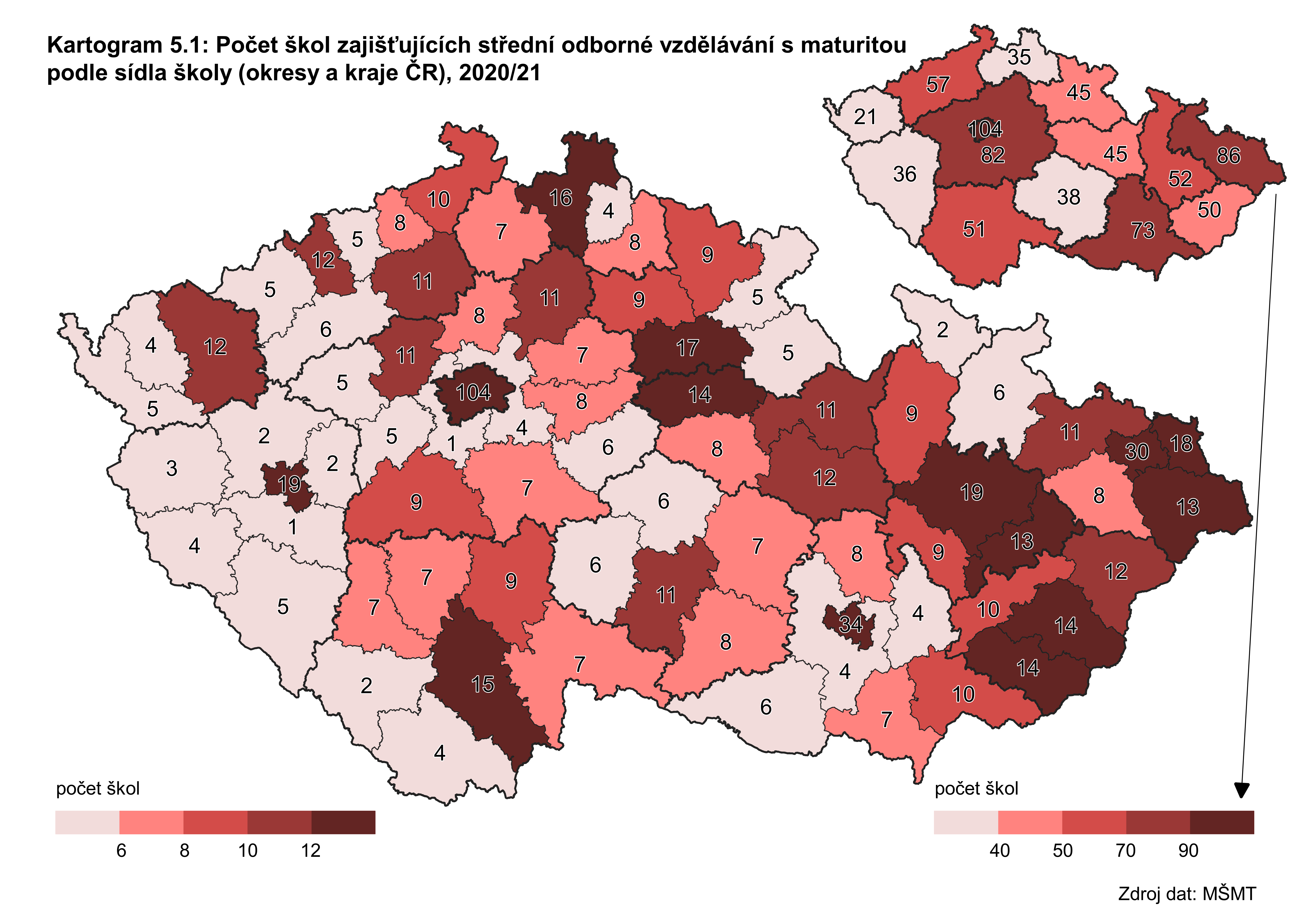 5.1 Počet škol zajišťujících střední odborné vzdělávání s maturitou podle sídla školy (okresy a kraje ČR), 2020/21
