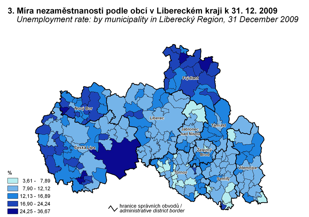 3. Míra nezaměstnanosti podle obcí v Libereckém kraji k 31. 12. 2009