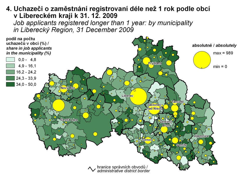 4. Uchazeči o zaměstnání registrovaní déle než 1 rok podle obcí v Libereckém kraji k 31. 12. 2009