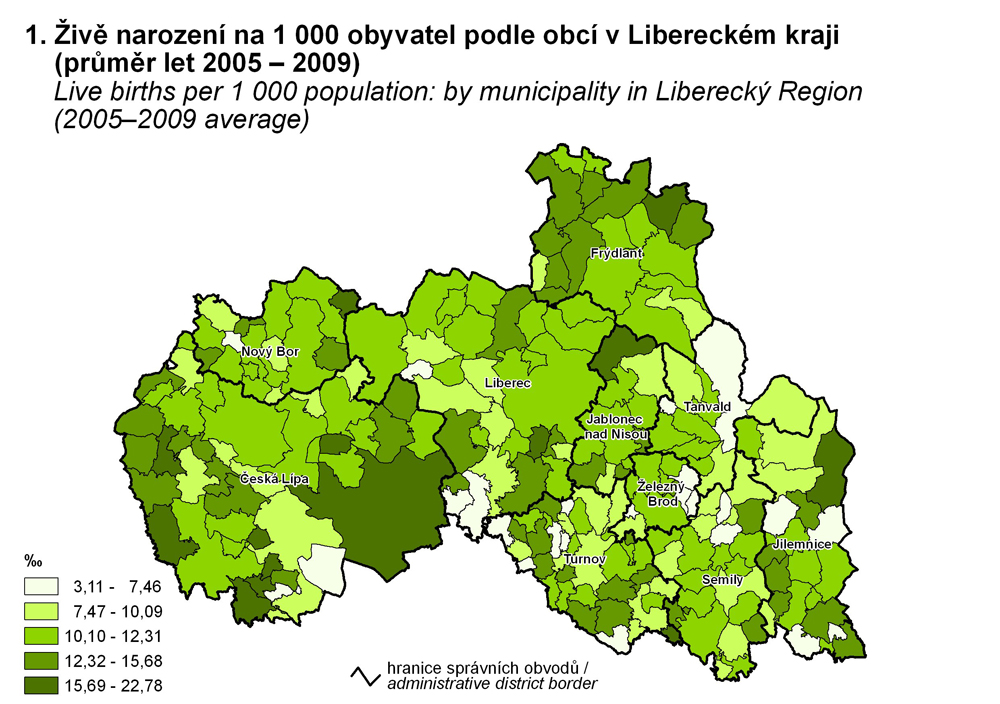 1. Živě narození na 1 000 obyvatel podle obcí v Libereckém kraji (průměr let 2005 – 2009)