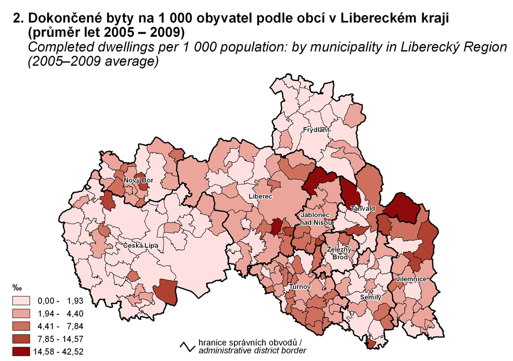 2. Dokončené byty na 1 000 obyvatel podle obcí v Libereckém kraji (průměr let 2005 – 2009)
