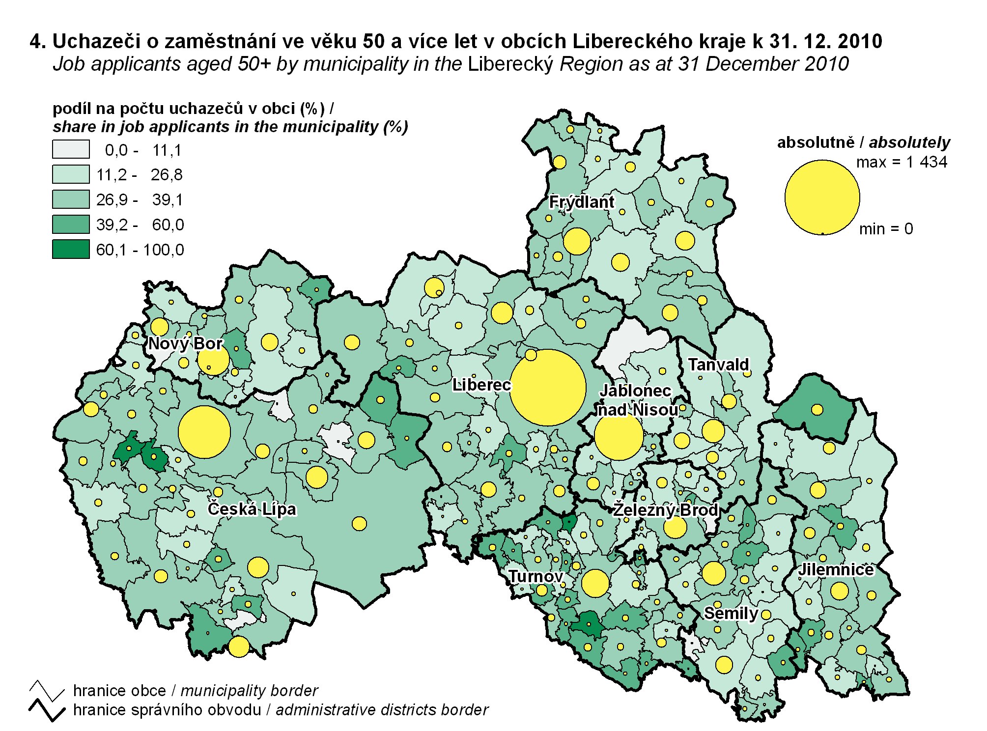 4. Uchazeči o zaměstnání ve věku 50 a více let v obcích Libereckého kraje k 31. 12. 2010