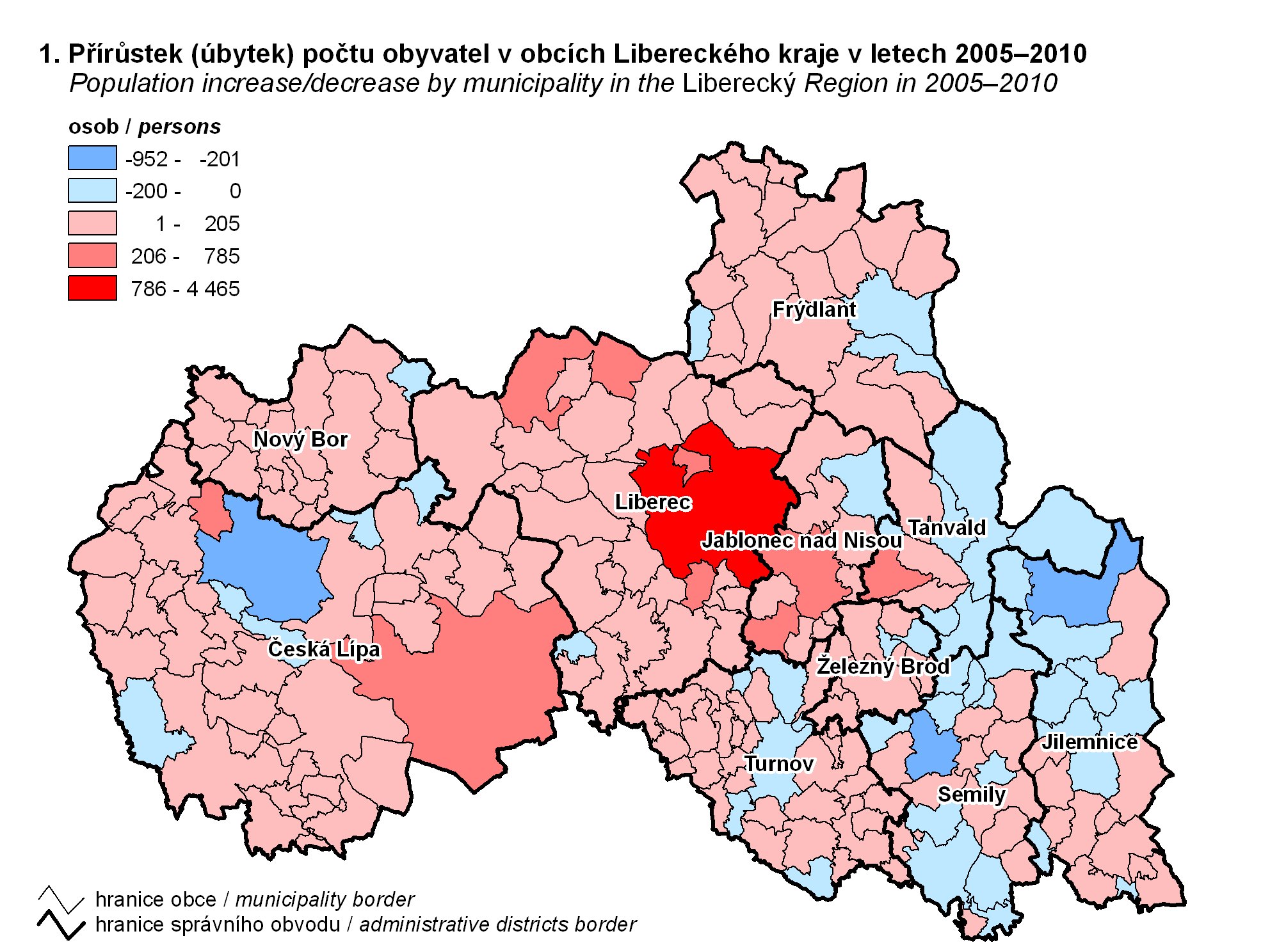 1. Přírůstek (úbytek) počtu obyvatel v obcích Libereckého kraje v letech 2005–2010
