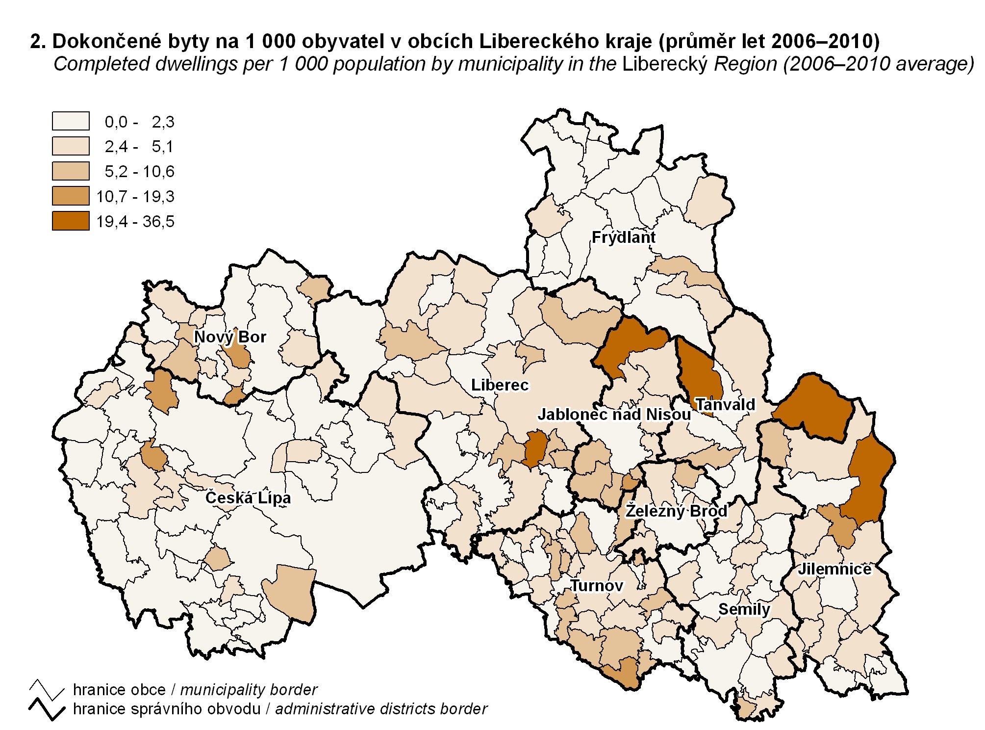 2. Dokončené byty na 1 000 obyvatel v obcích Libereckého kraje (průměr let 2006–2010)