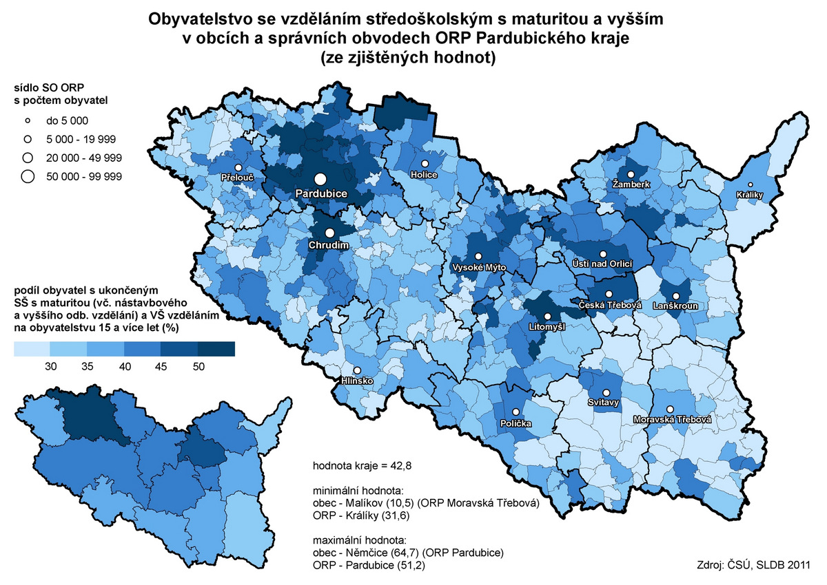 Obyvatelstvo se středoškolským vzděláním s maturitou a vyšším vzděláním v obcích a správních obvodech ORP Pardubického kraje