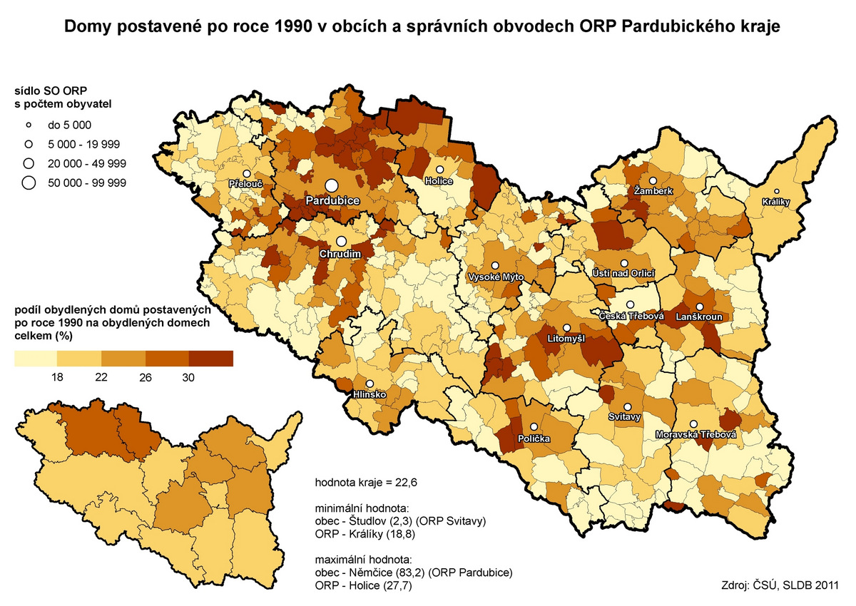 Domy postavené po roce 1990 v obcích a správních obvodech ORP Pardubického kraje