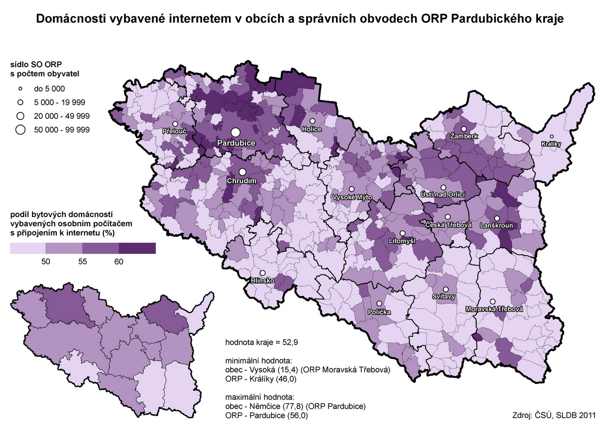 Domácnosti vybavené internetem v obcích a správních obvodech ORP Pardubického kraje